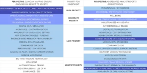 The table says that by focusing on the landscape of healthcare from multiple perspectives, the highest priority areas to invest in are managing and auditing of health outcomes (i.e., PROMs — patient-reported outcome measures rather than ClinROs — clinician-reported outcomes) and sharing of medical data. Of moderate priority is virtual consultation, diagnosis (basic medical science) and education / preventative healthcare.